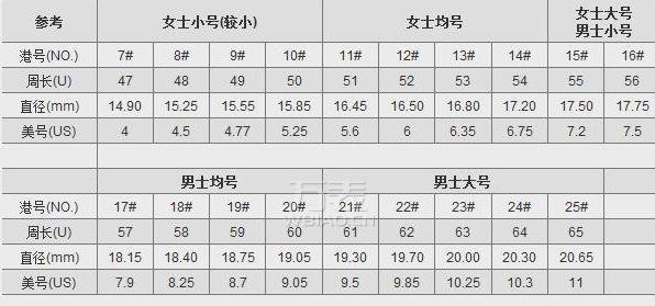 類似于衣服的S、M、L、XL等尺碼,戒指的尺寸由戒指圈號表示,戒指圈號以戒指的內(nèi)圈直徑和內(nèi)圈周長為依據(jù),用一個特定的號數(shù)來區(qū)分戒指的大小。不同的國家戒指圈號對應(yīng)表不一樣,有美碼、港碼、日碼等之分,且相同的圈號,對應(yīng)男女的大小也不一樣。目前中國多采用港碼。